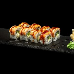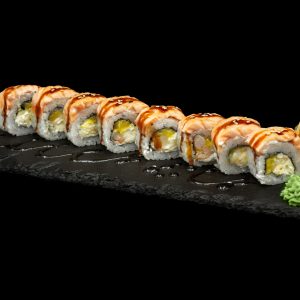 Eel, tomato, avocado, cucumber, cream cheese, sesame seeds, cheese sauce. Allergens: (1,3,6,8,11,12,13)