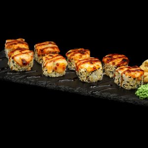 Salmon, cream cheese, hot cheese sauce, flying fish roe. Allergens: (1,3,6,8,11,12,13)