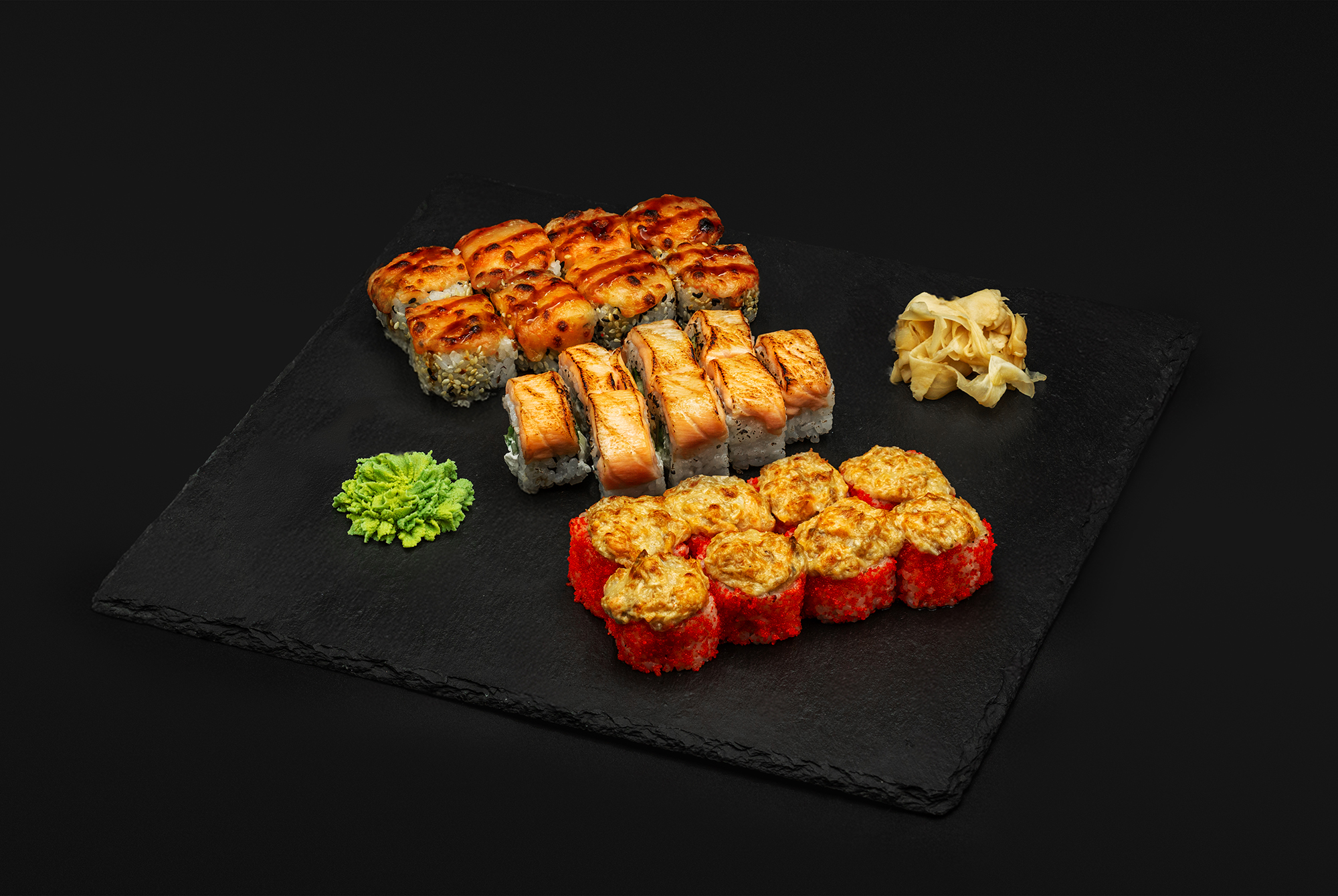 YASUSHI MAKI, SAIDZICU MAKI, PHILADELPHIA SEESAM MAKI, CALIFORNIA EBI MAKI, SAKE CHEESE MAKI, EBI CHEESE MAKI, AVOKADO MAKI (56 rolls). Allergens: