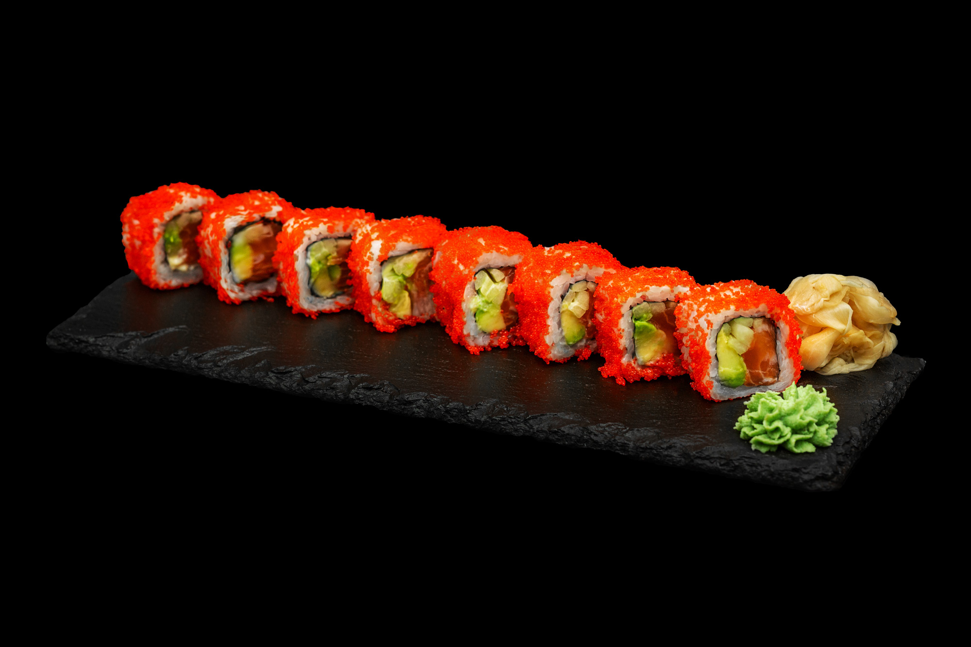 Salmon, avocado, cucumber, mayonnaise, flying fish roe